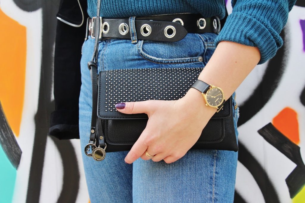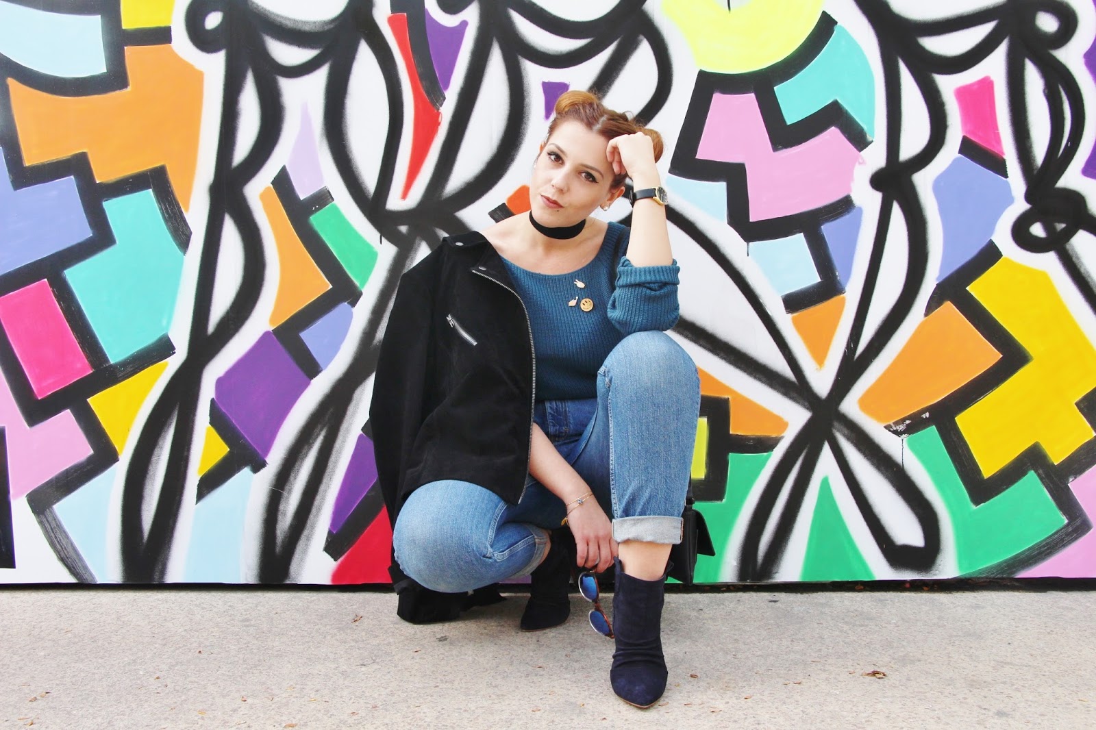 Pas mal de nouveautés sur cet outfit: En plus de la coiffure WTF, j’ai sortie ma nouvelle ceinture oeillet de chez IKKS. Les bottines aussi viennent de la marque. Je les avais shoppé pendant les soldes d’été et commence tout juste à en profiter maintenant. Le petit pull bleu vient de chez Babou, petit basique bien utile au vue de ces premières fraîcheurs.