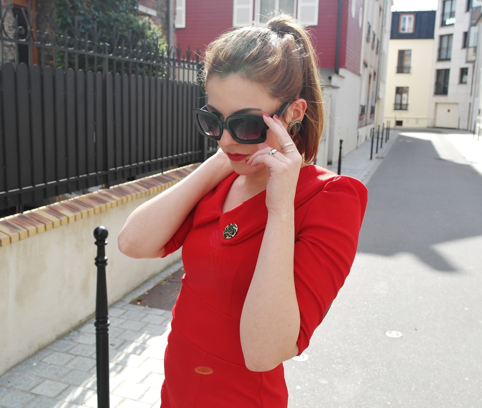 Cette robe rouge te va à merveille et te donne une allure rétro fabuleuse ! Les collants avec la ligne sont superbes sur toi et les lunettes te vont à merveille ma douce :). T'es superbe !